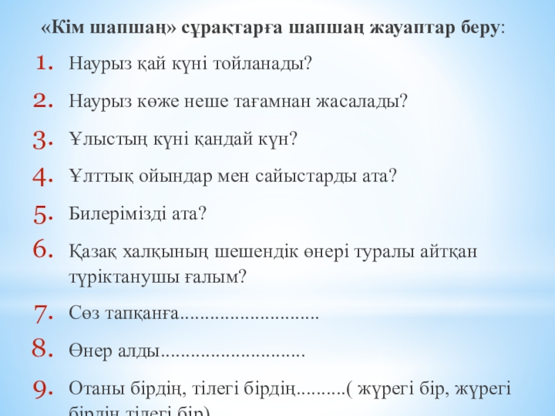 Слайд 7«Кім шапшаң» сұрақтарға шапшаң жауаптар беру: