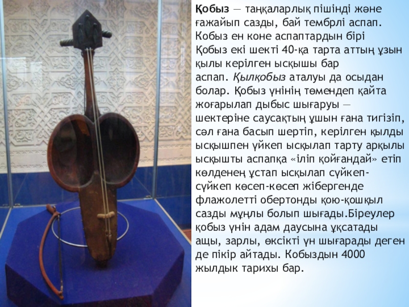 Слайд 17Қобыз — таңқаларлық пішінді және ғажайып сазды, бай тембрлі аспап. Кобыз ен