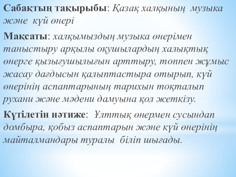 Слайд 2Сабақтың тақырыбы: Қазақ халқының музыка және күй өнері