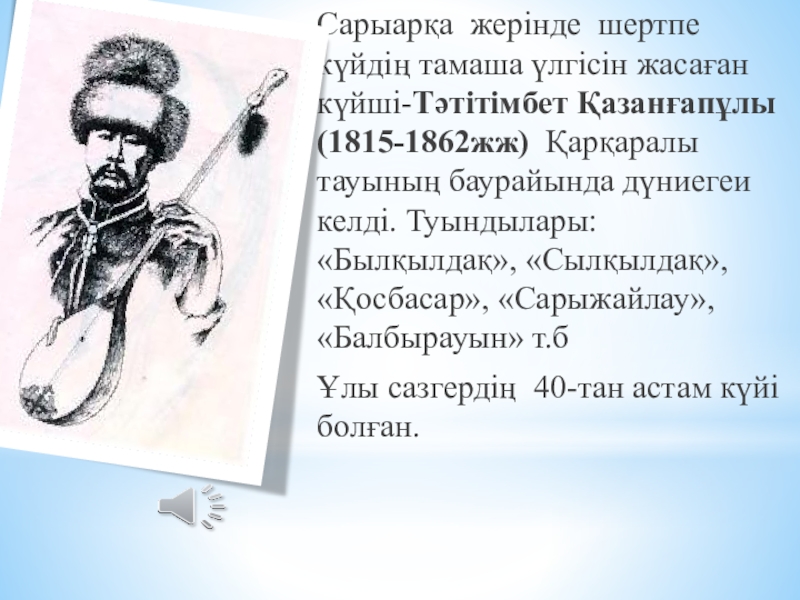 Слайд 16Сарыарқа жерінде шертпе күйдің тамаша үлгісін жасаған күйші-Тәтітімбет Қазанғапұлы (1815-1862жж) Қарқаралы