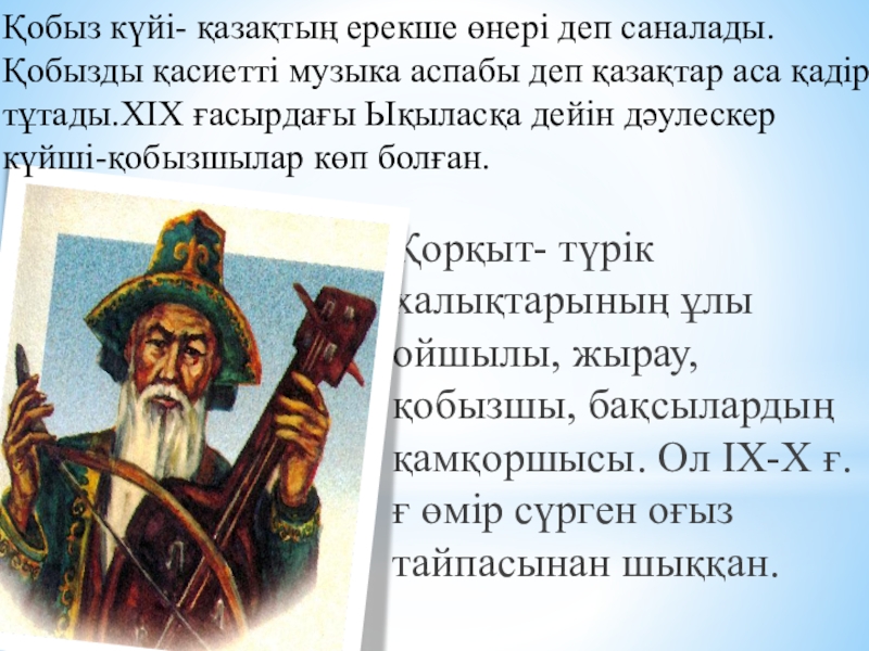 Слайд 18Қорқыт- түрік халықтарының ұлы ойшылы, жырау, қобызшы, бақсылардың қамқоршысы. Ол ІХ-Х