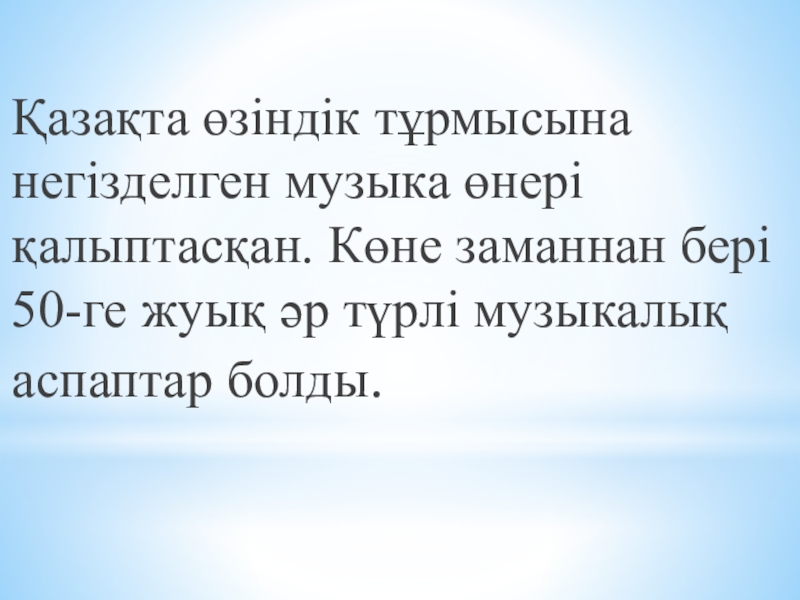 Слайд 9Қазақта өзіндік тұрмысына негізделген музыка өнері қалыптасқан. Көне заманнан бері 50-ге