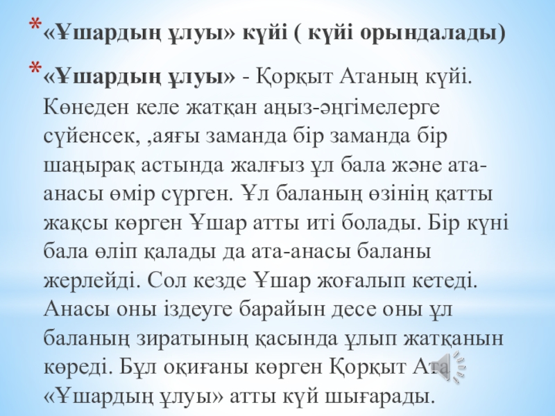 Слайд 19«Ұшардың ұлуы» күйі ( күйі орындалады)