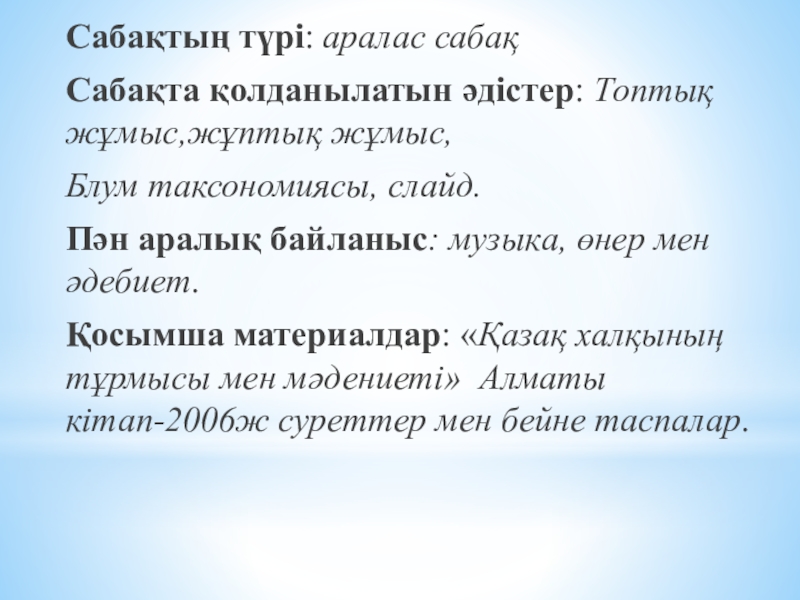 Қосымша материалдар: «Қазақ халқының тұрмысы мен мәдениеті» Алматы кітап-2006ж суреттер мен бейне таспалар.