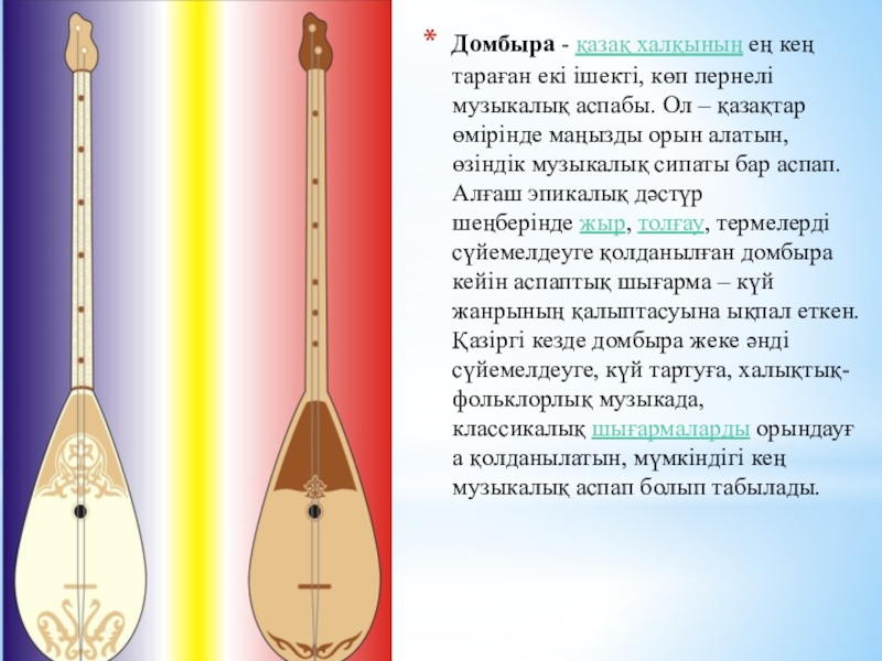 Слайд 11Домбыра - қазақ халқының ең кең тараған екі ішекті, көп пернелі музыкалық аспабы. Ол
