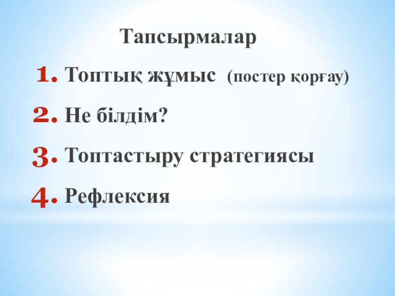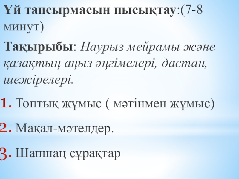 Слайд 4Үй тапсырмасын пысықтау:(7-8 минут)