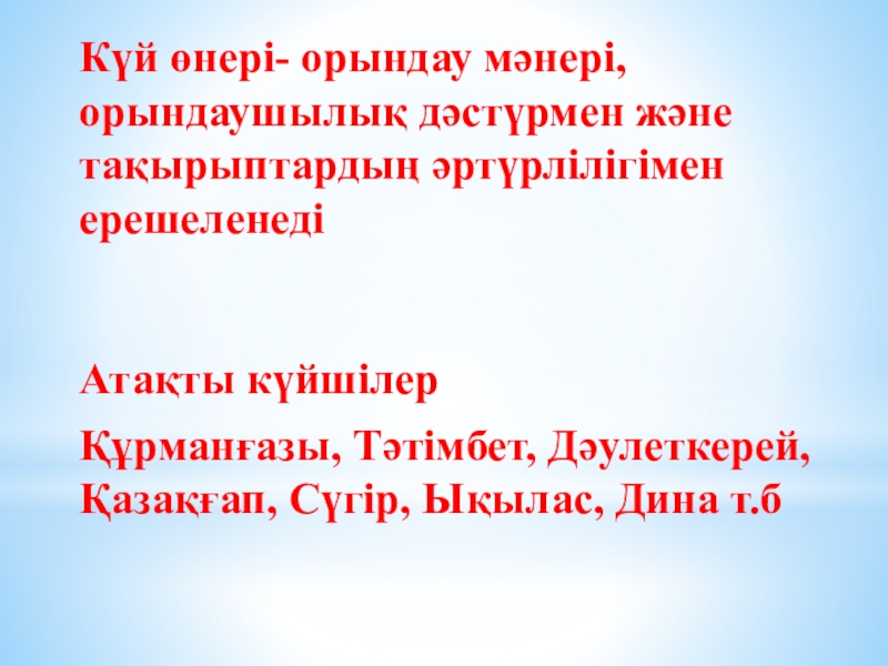 Слайд 13Күй өнері- орындау мәнері, орындаушылық дәстүрмен және тақырыптардың әртүрлілігімен ерешеленеді