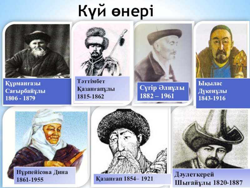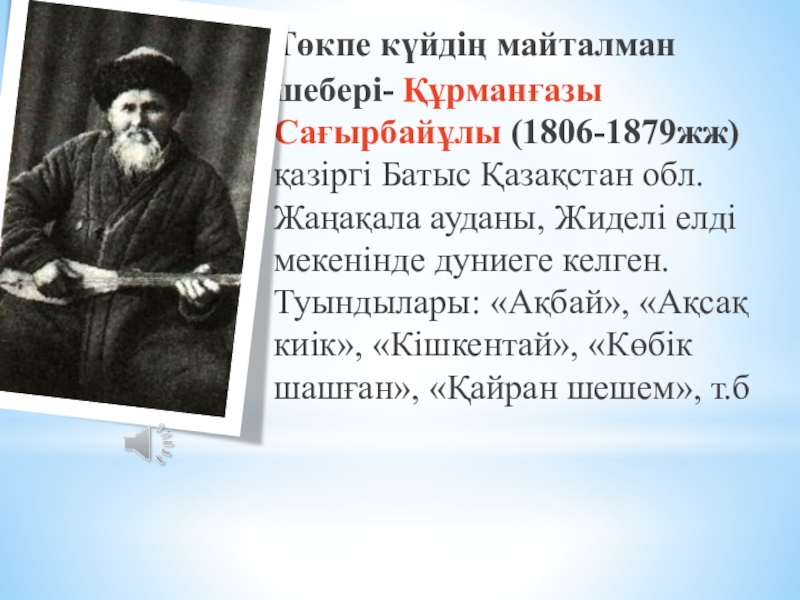 Слайд 15Төкпе күйдің майталман шебері- Құрманғазы Сағырбайұлы (1806-1879жж) қазіргі Батыс Қазақстан обл.