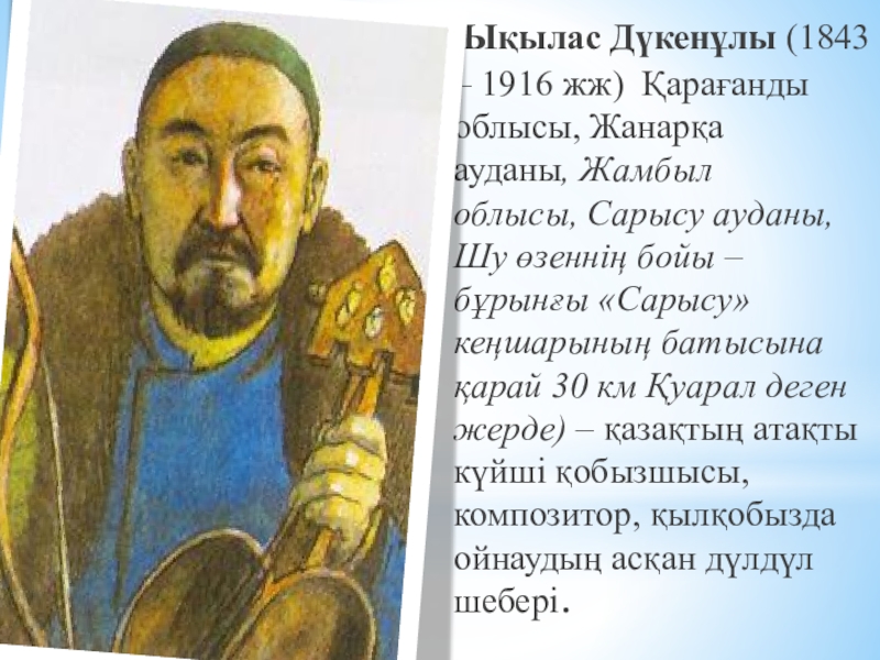 Слайд 20 Ықылас Дүкенұлы (1843 – 1916 жж) Қарағанды облысы, Жанарқа ауданы, Жамбыл