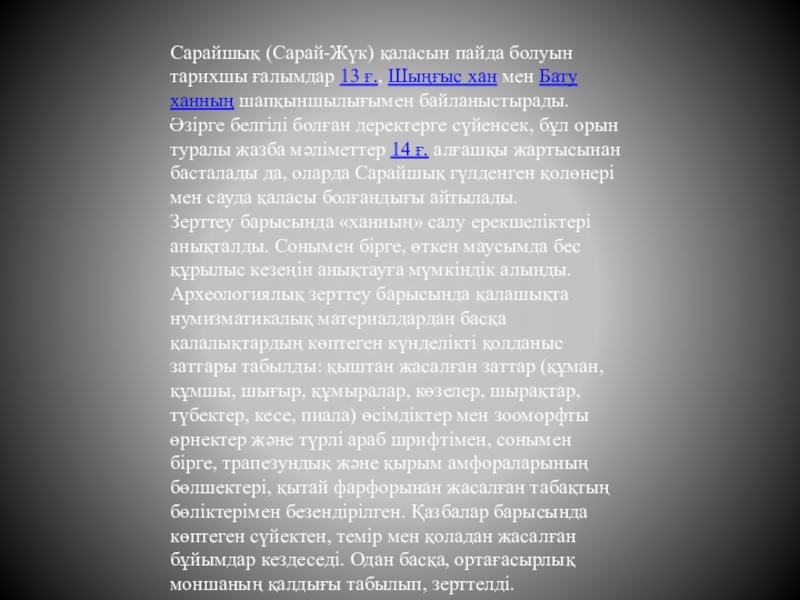 Слайд 5Сарайшық (Сарай-Жүк) қаласын пайда болуын тарихшы ғалымдар 13 ғ., Шыңғыс хан