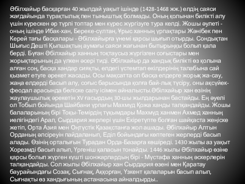 Слайд 3Әбілхайыр басқарған 40 жылдай уақыт ішінде (1428-1468 жж.) елдің саяси жағдайында