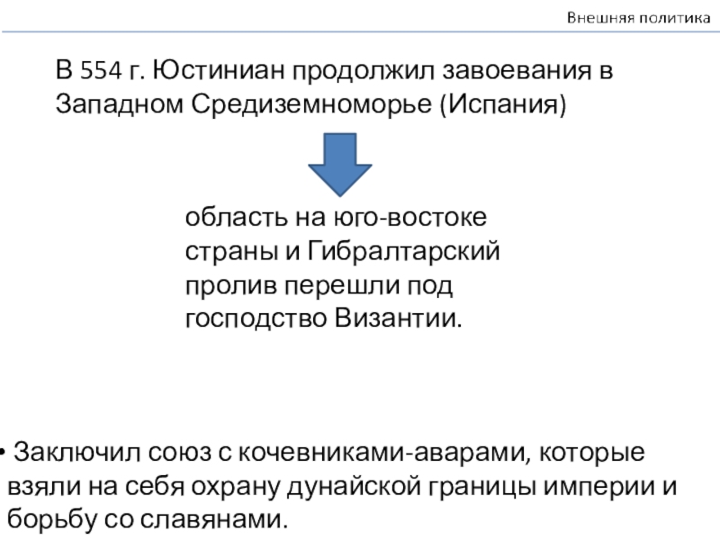 Заключил союз с кочевниками-аварами, которые взяли на себя охрану дунайской границы империи и борьбу со славянами.
