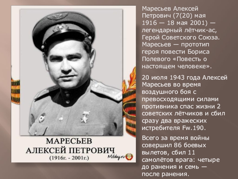 20 июля 1943 года Алексей Маресьев во время воздушного боя с превосходящими силами противника спас жизни 2 советских лётчиков и сбил сразу два вражеских истребителя Fw.190.