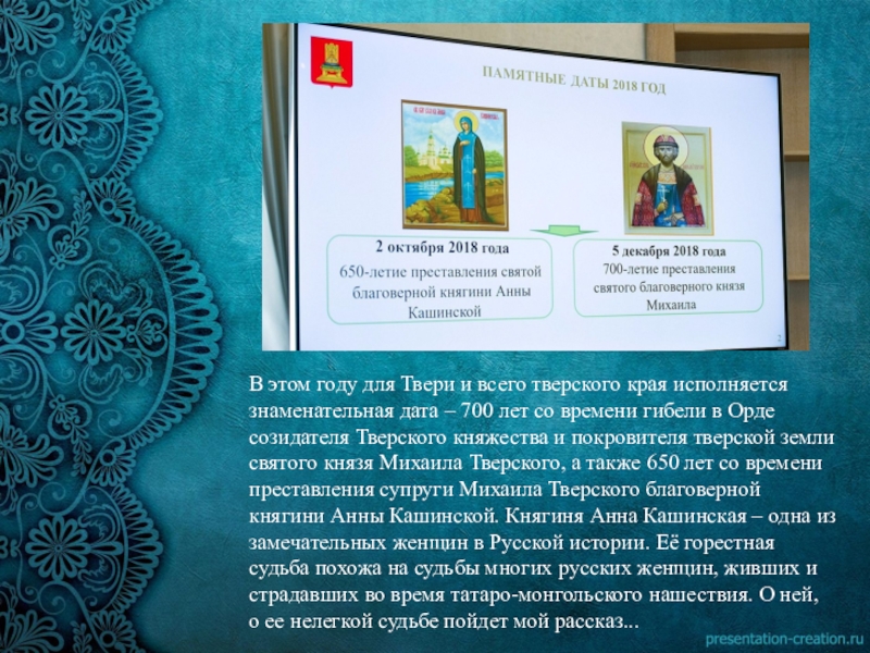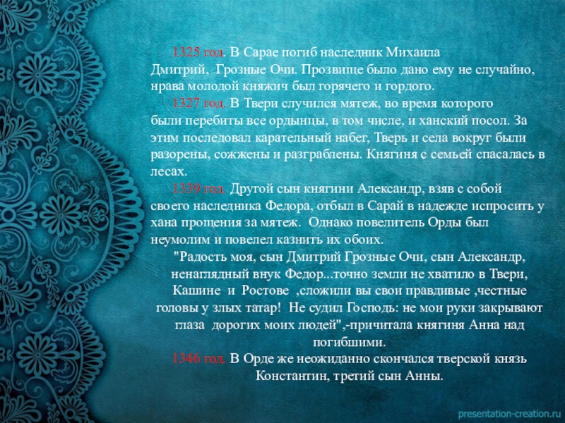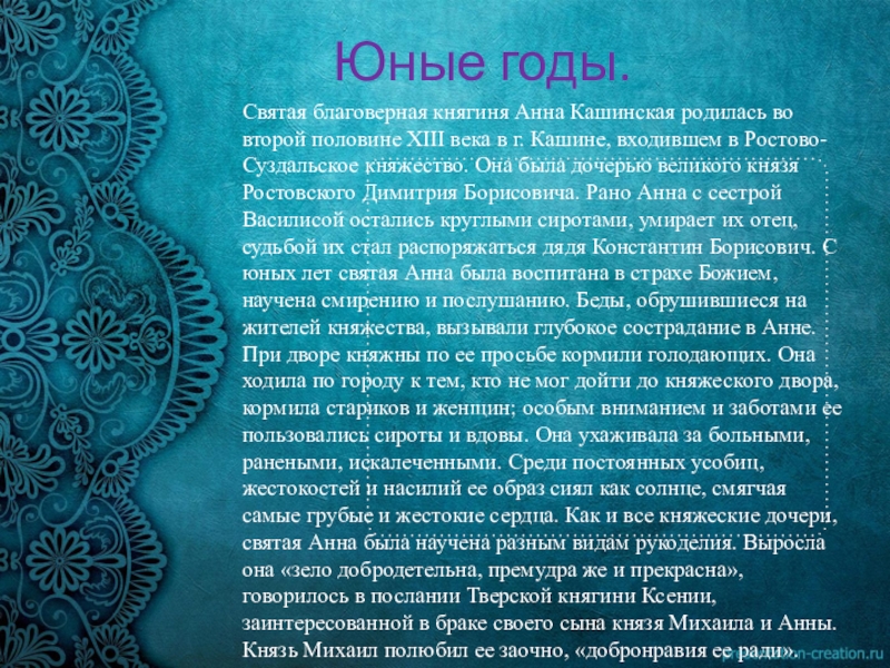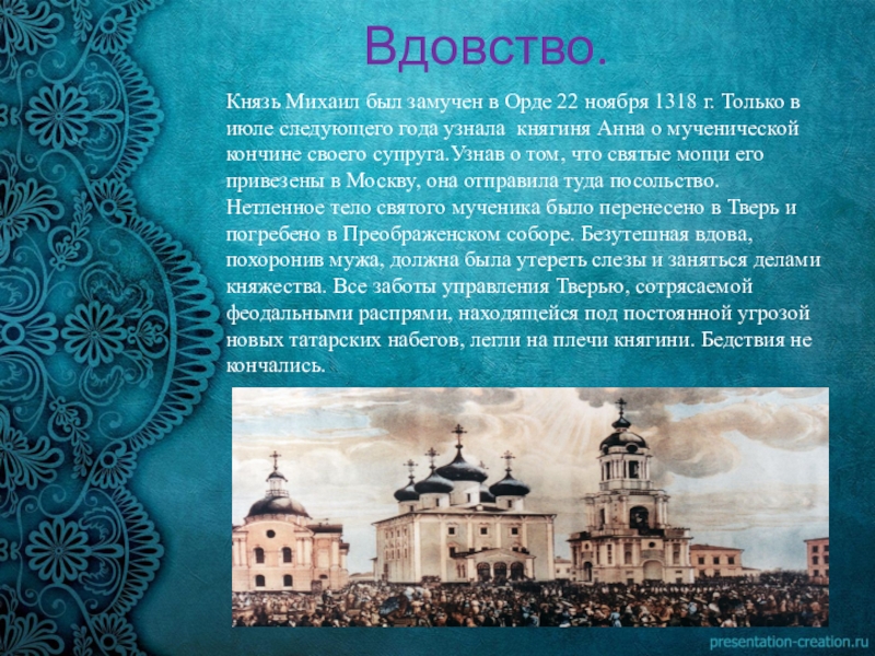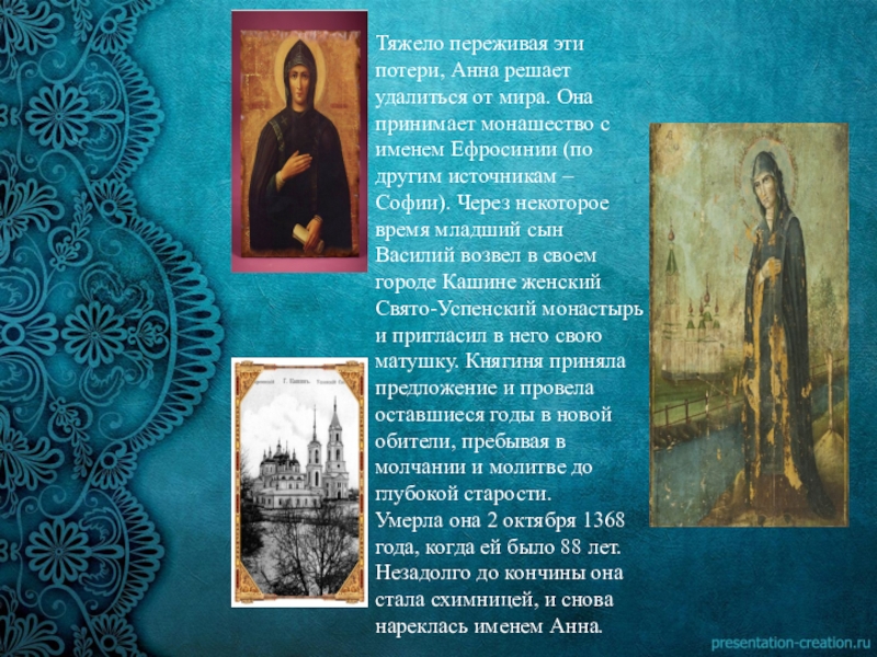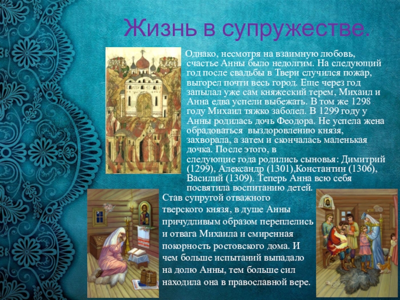 Став супругой отважного тверского князя, в душе Анны причудливым образом переплелись и отвага Михаила и смиренная покорность ростовского дома. И чем больше испытаний выпадало на долю Анны, тем больше сил находила она в православной вере.