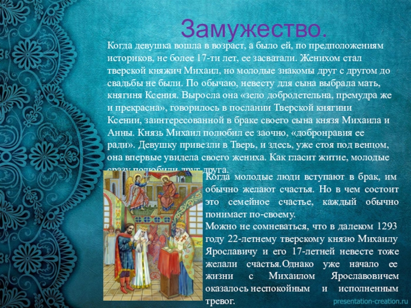 Можно не сомневаться, что в далеком 1293 году 22-летнему тверскому князю Михаилу Ярославичу и его 17-летней невесте тоже желали счастья.Однако уже начало ее жизни с Михаилом Ярославовичем оказалось неспокойным и исполненным тревог.