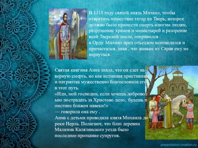 Святая княгиня Анна знала, что он едет на верную смерть, но как истинная христианка и патриотка мужественно благословила его в этот путь.«Иди, мой господин, если хочешь добровольно пострадать за Христово дело, будешь поистине блажен навеки!»— говорила она ему .