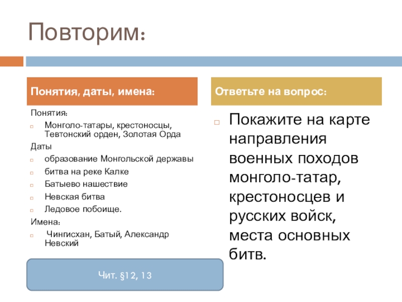 Показывать на карте направления военных походов монголо-татар, крестоносцев и русских войск, места основных битв.