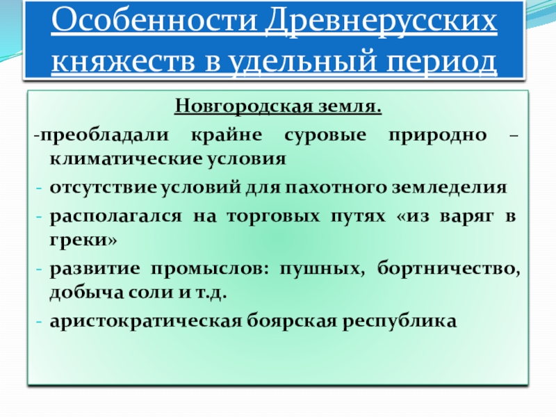 Особенности Древнерусских княжеств в удельный периодНовгородская земля. -преобладали крайне суровые природно – климатические условияотсутствие условий для пахотного