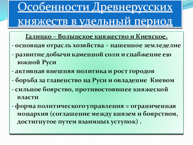 Особенности Древнерусских княжеств в удельный периодГалицко – Волынское княжество и Киевское. - основная отрасль хозяйства – пашенное земледелие- развитие добычи каменной соли и снабжение ею южной Руси- активная внешняя политика и рост городов- борьба за главенство