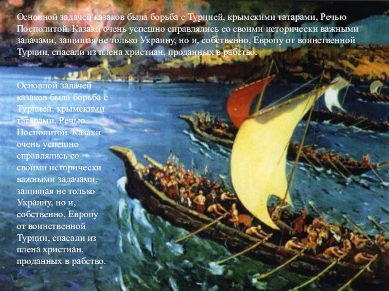 Основной задачей казаков была борьба с Турцией, крымскими татарами, Речью Посполитой. Казаки очень успешно справлялись со своими исторически важными задачами, защищая не только Украину, но и, собственно, Европу от воинственной Турции, спасали из плена христиан, проданных в рабство.
