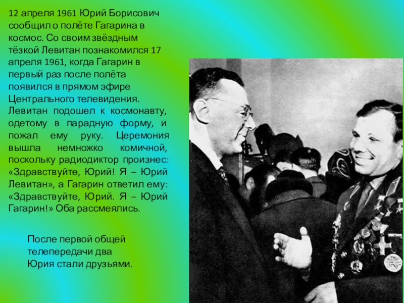 Левитан подошел к космонавту, одетому в парадную форму, и пожал ему руку. Церемония вышла немножко комичной, поскольку радиодиктор произнес: «Здравствуйте, Юрий! Я – Юрий Левитан», а Гагарин ответил ему: «Здравствуйте, Юрий. Я – Юрий Гагарин!» Оба рассмеялись.