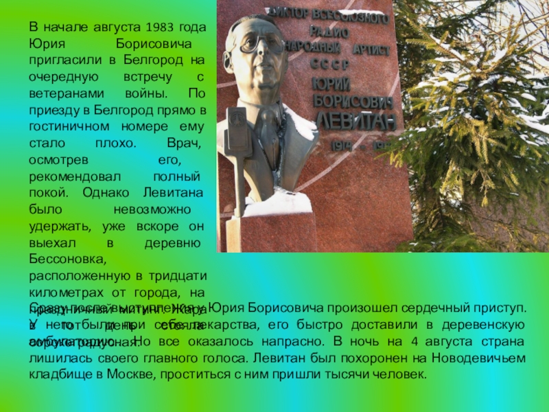 очередную встречу с ветеранами войны. По приезду в Белгород прямо в гостиничном номере ему стало плохо. Врач, осмотрев его, рекомендовал полный покой. Однако Левитана было невозможно удержать, уже вскоре он выехал в деревню Бессоновка, расположенную в тридцати километрах от города, на праздничный митинг. Жара в тот день стояла сорокоградусная.