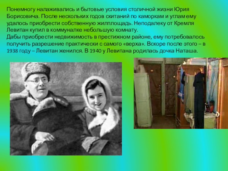 Дабы приобрести недвижимость в престижном районе, ему потребовалось получить разрешение практически с самого «верха». Вскоре после этого – в 1938 году – Левитан женился. В 1940 у Левитана родилась дочка Наташа.