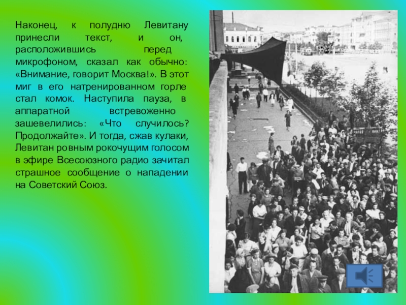 Слайд 13Наконец, к полудню Левитану принесли текст, и он, расположившись перед микрофоном,