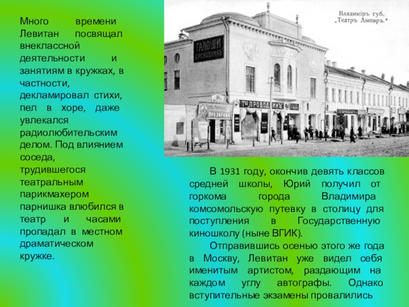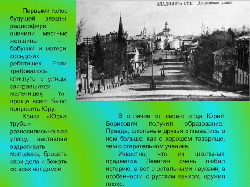 Слайд 7У Левитана были уникальные от природы голосовые данные, но чтобы стать