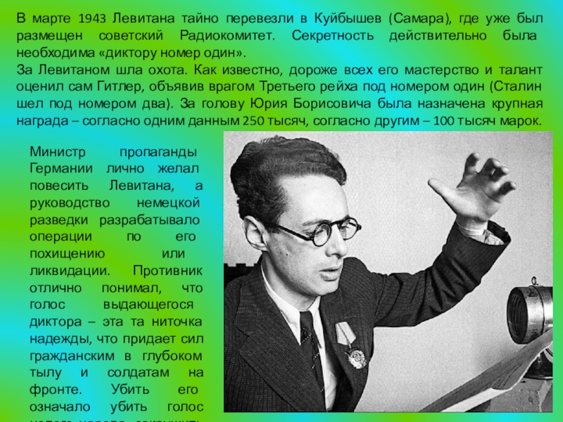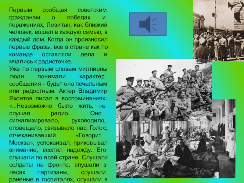 Слайд 15Первым сообщая советским гражданам о победах и поражениях, Левитан, как близкий