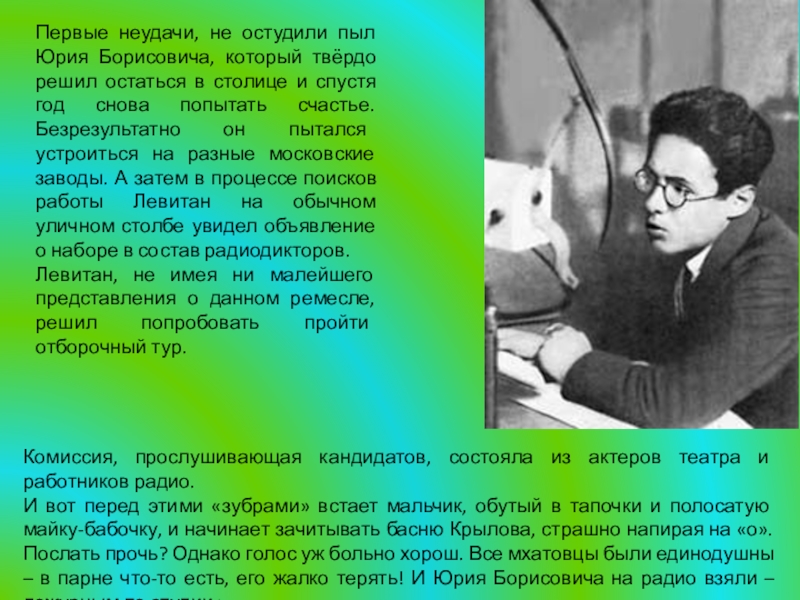 в столице и спустя год снова попытать счастье. Безрезультатно он пытался устроиться на разные московские заводы. А затем в процессе поисков работы Левитан на обычном уличном столбе увидел объявление о наборе в состав радиодикторов.