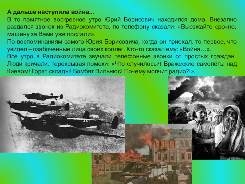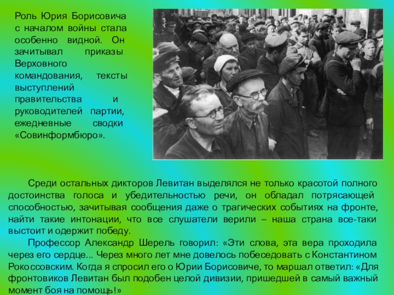 Слайд 14Роль Юрия Борисовича с началом войны стала особенно видной. Он зачитывал