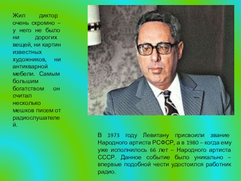 В 1973 году Левитану присвоили звание Народного артиста РСФСР, а в 1980 – когда ему уже исполнилось 66 лет – Народного артиста СССР. Данное событие было уникально – впервые подобной чести удостоился работник радио.