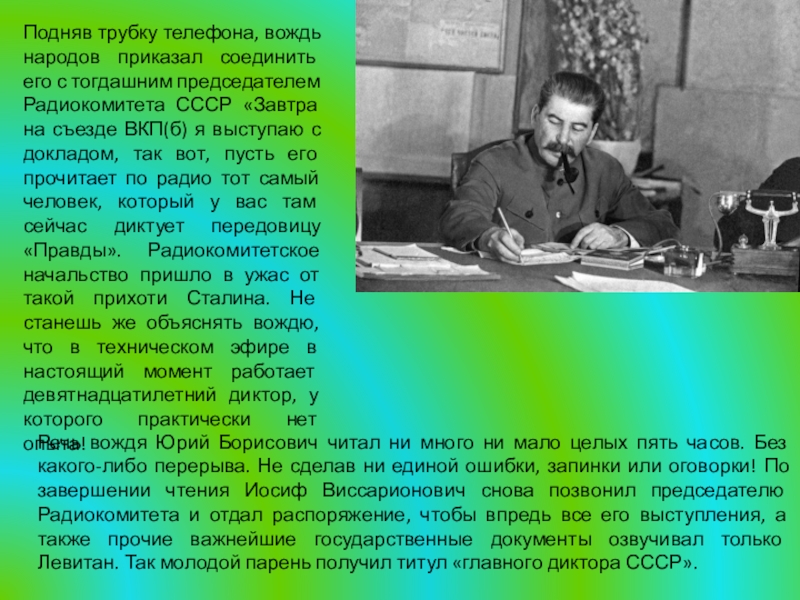 Радиокомитета СССР «Завтра на съезде ВКП(б) я выступаю с докладом, так вот, пусть его прочитает по радио тот самый человек, который у вас там сейчас диктует передовицу «Правды». Радиокомитетское начальство пришло в ужас от такой прихоти Сталина. Не станешь же объяснять вождю, что в техническом эфире в настоящий момент работает девятнадцатилетний диктор, у которого практически нет опыта!
