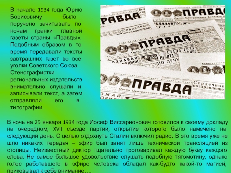 Слайд 8В начале 1934 года Юрию Борисовичу было поручено зачитывать по ночам