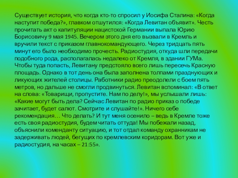 победа?», главком отшутился: «Когда Левитан объявит». Честь прочитать акт о капитуляции нацистской Германии выпала Юрию Борисовичу 9 мая 1945. Вечером этого дня его вызвали в Кремль и вручили текст с приказом главнокомандующего. Через тридцать пять минут его было необходимо прочесть. Радиостудия, откуда шли передачи подобного рода, располагалась недалеко от Кремля, в здании ГУМа. Чтобы туда попасть, Левитану предстояло всего лишь пересечь Красную площадь. Однако в тот день она была заполнена толпами празднующих и ликующих жителей столицы. Работники радио преодолели с боем пять метров, но дальше не смогли продвинуться. Левитан вспоминал: «В ответ на слова: «Товарищи, пропустите. Нам по делу!», мы услышали лишь: «Какие могут быть дела? Сейчас Левитан по радио приказ о победе зачитает, будет салют. Смотрите и слушайте!». Ничего себе рекомендация… Что делать? И тут меня осенило – ведь в Кремле тоже есть своя радиостудия, будем читать оттуда! Мы побежали назад, объяснили коменданту ситуацию, и тот отдал команду охранникам не задерживать людей, бегущих по кремлевским коридорам. Вот уже и радиостудия, на часах – 21:55».