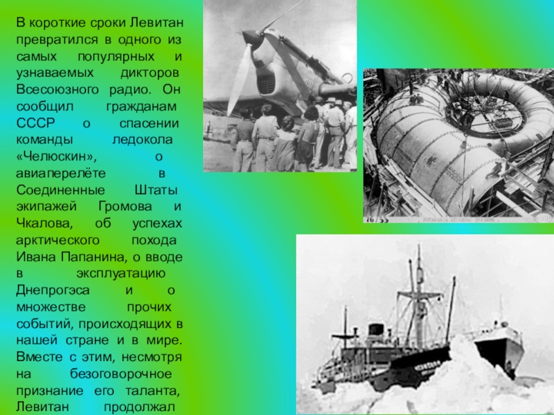 узнаваемых дикторов Всесоюзного радио. Он сообщил гражданам СССР о спасении команды ледокола «Челюскин», о авиаперелёте в Соединенные Штаты экипажей Громова и Чкалова, об успехах арктического похода Ивана Папанина, о вводе в эксплуатацию Днепрогэса и о множестве прочих событий, происходящих в нашей стране и в мире. Вместе с этим, несмотря на безоговорочное признание его таланта, Левитан продолжал основательно работать над дикцией.