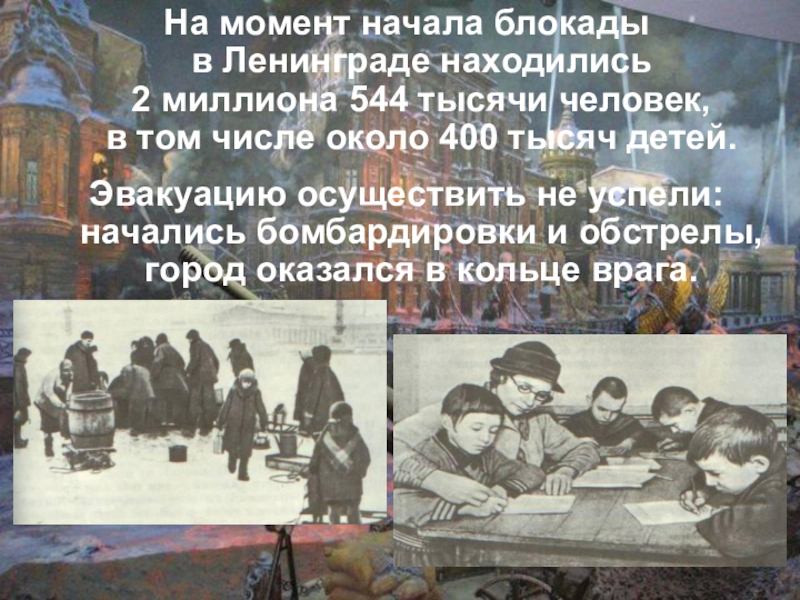в Ленинграде находились 2 миллиона 544 тысячи человек, в том числе около 400 тысяч детей.