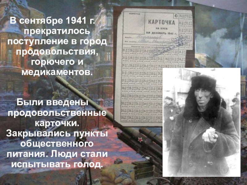 Слайд 6В сентябре 1941 г. прекратилось поступление в город продовольствия, горючего и