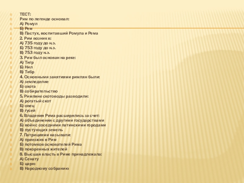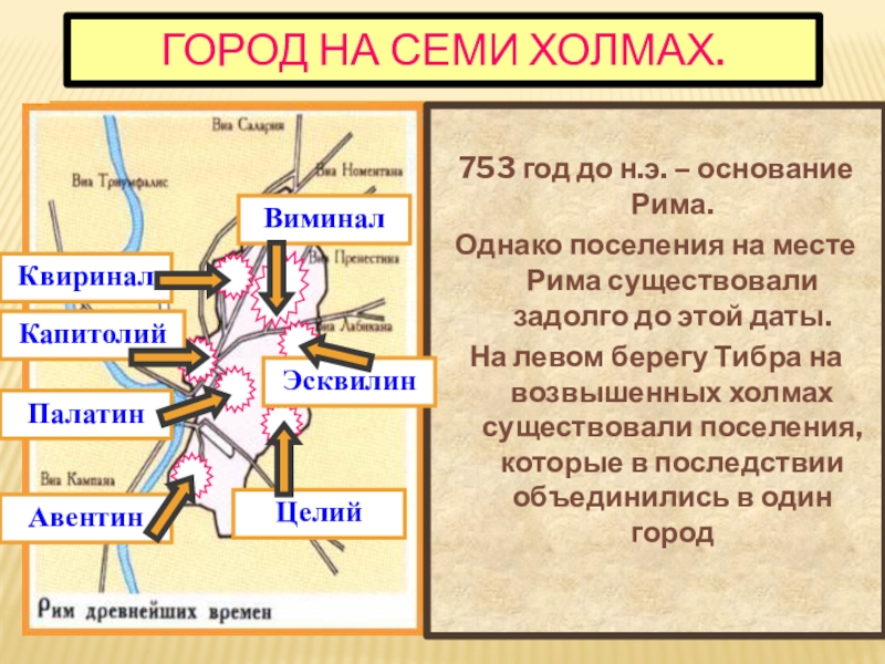 На левом берегу Тибра на возвышенных холмах существовали поселения, которые в последствии объединились в один город