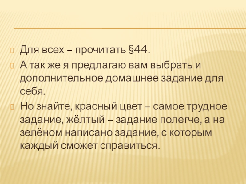 Но знайте, красный цвет – самое трудное задание, жёлтый – задание полегче, а на зелёном написано задание, с которым каждый сможет справиться.