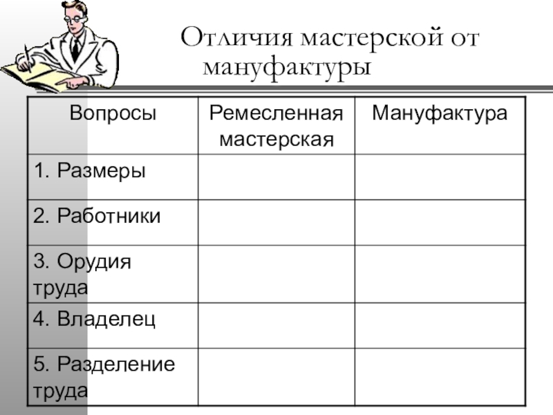 Слайд 7 Отличия мастерской от мануфактуры