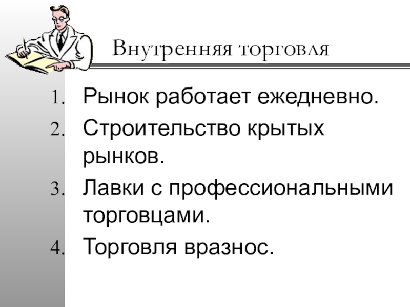 Внутренняя торговляРынок работает ежедневно.Строительство крытых рынков.Лавки с профессиональными торговцами.Торговля вразнос.