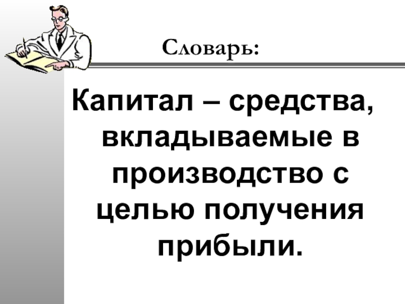 Словарь:Капитал – средства, вкладываемые в производство с целью получения прибыли.