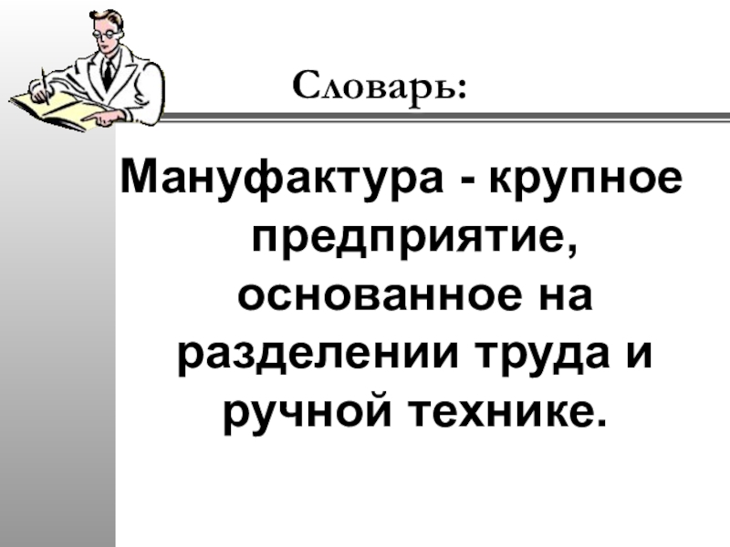 Словарь:Мануфактура - крупное предприятие, основанное на разделении труда и ручной технике.