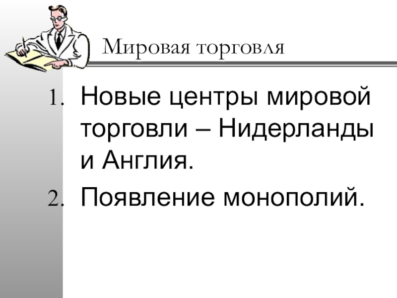 Мировая торговляНовые центры мировой торговли – Нидерланды и Англия.Появление монополий.