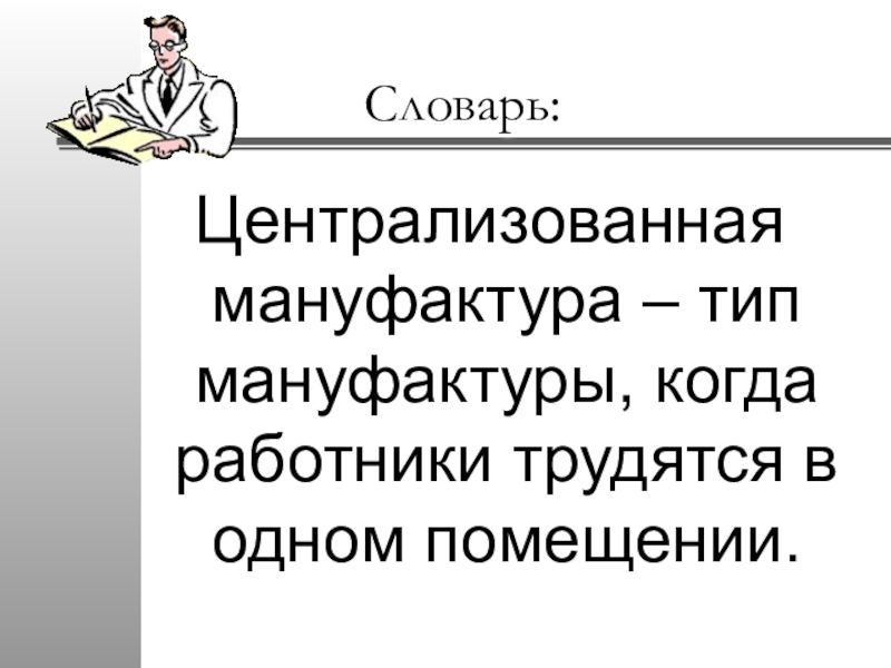 Централизованная мануфактура – тип мануфактуры, когда работники трудятся в одном помещении.