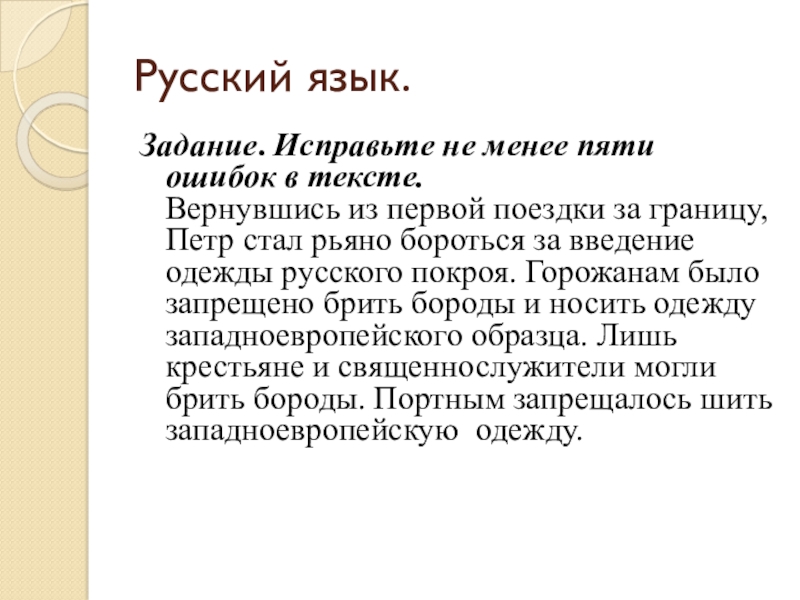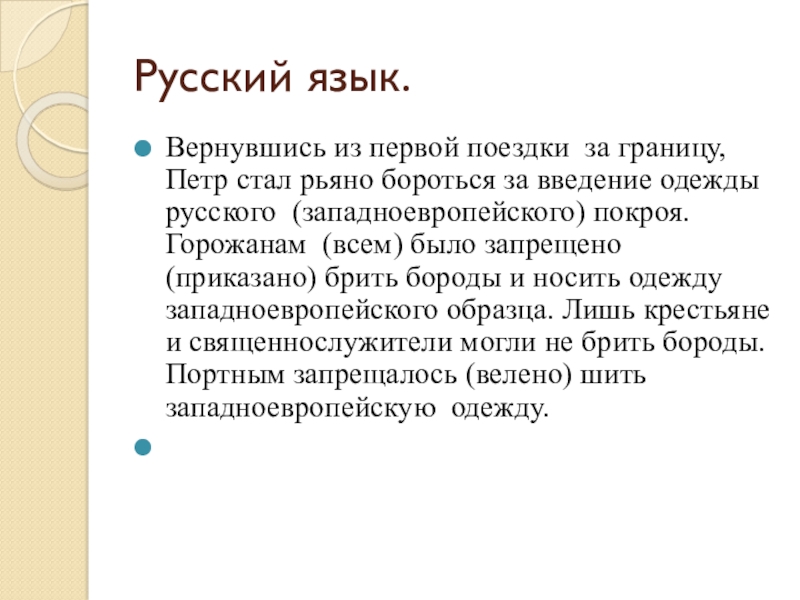 поездки за границу, Петр стал рьяно бороться за введение одежды русского покроя. Горожанам было запрещено брить бороды и носить одежду западноевропейского образца. Лишь крестьяне и священнослужители могли брить бороды. Портным запрещалось шить западноевропейскую одежду.