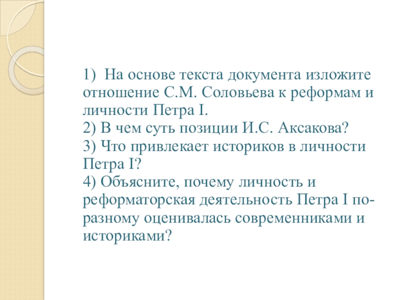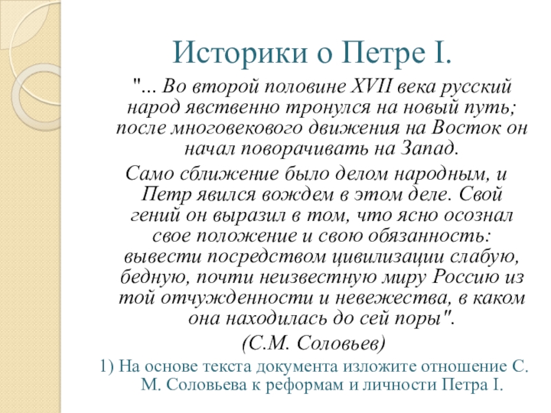 1) На основе текста документа изложите отношение С.М. Соловьева к реформам и личности Петра I.