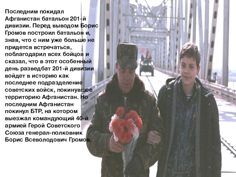 Слайд 17Последним покидал Афганистан батальон 201-й дивизии. Перед выводом Борис Громов построил